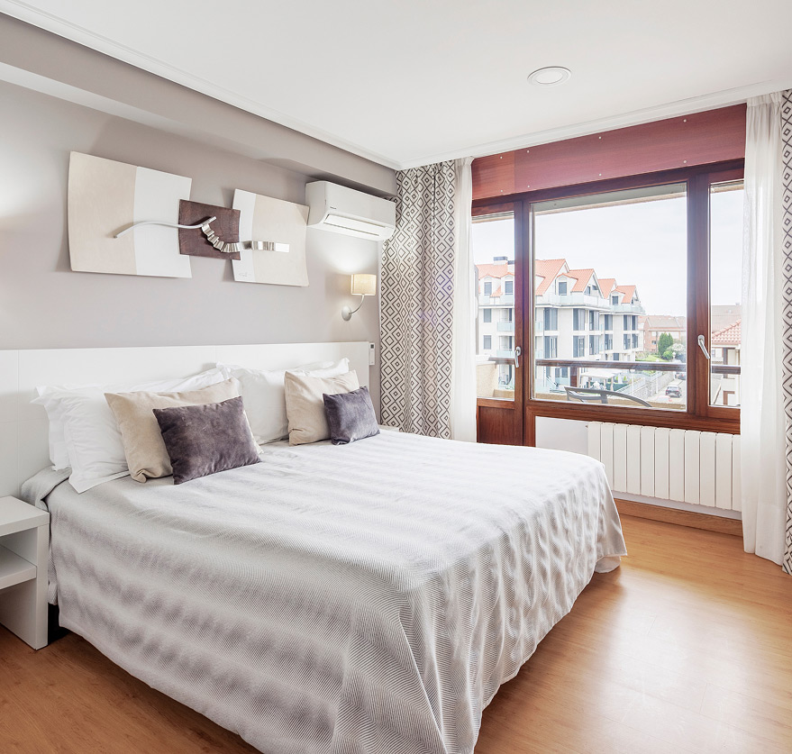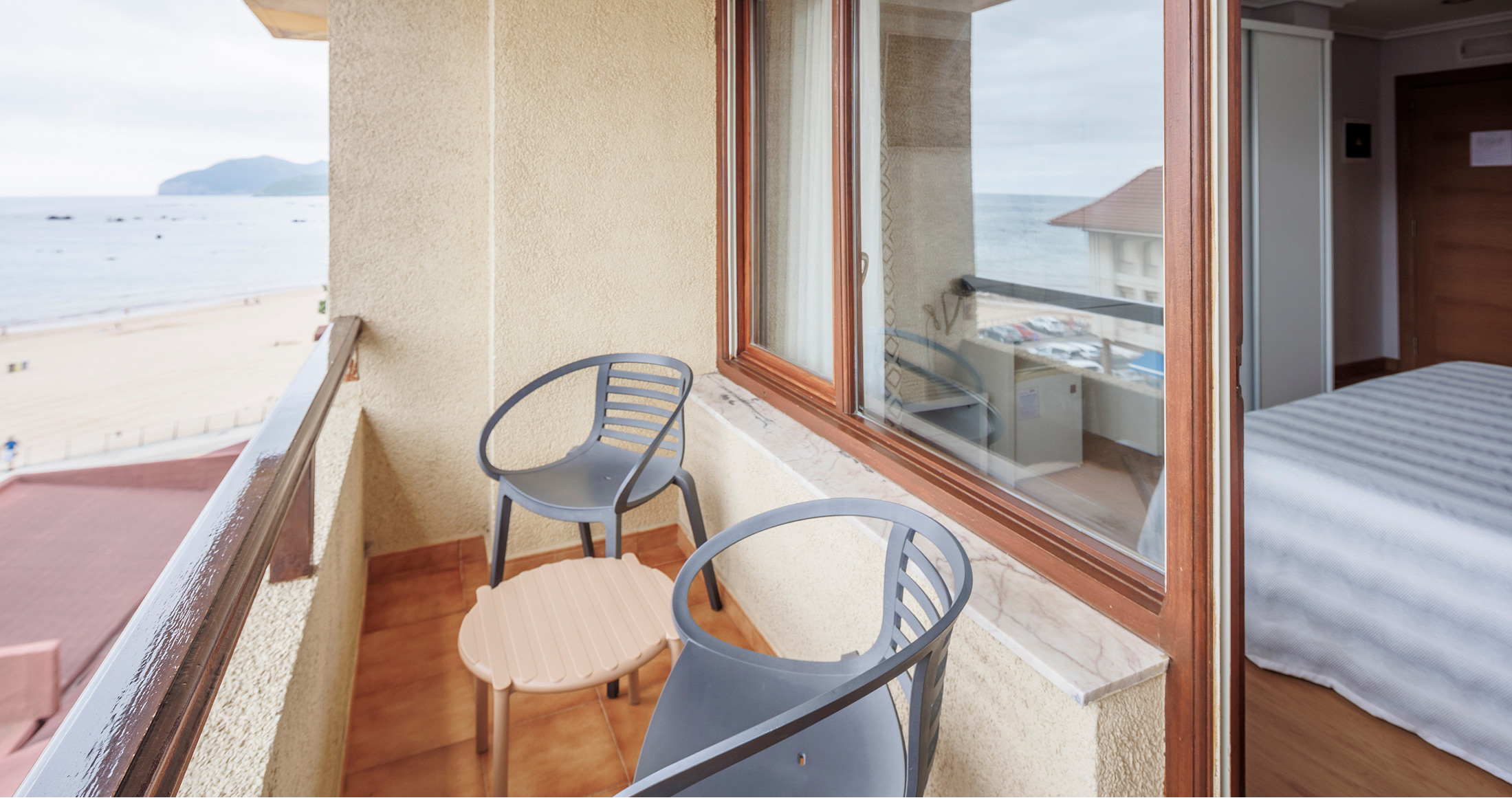 Disponemos de habitaciones con terraza y vistas laterales al mar. Acceso por ascensor. Disponen de aire acondicionado en la temporada de verano. Habitaciones con cama doble KING SIZE (1,80cm) o dos camas individuales.